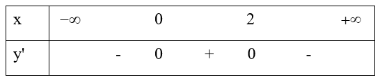 \(y' = - 3{x^2} + 6x\); \(y' = 0 \Leftrightarrow - 3{x^2} + 6x = 0 \Leftrightarrow \left[ \begin{array}{l}x = 0\\x = 2\end{array} \right.\)